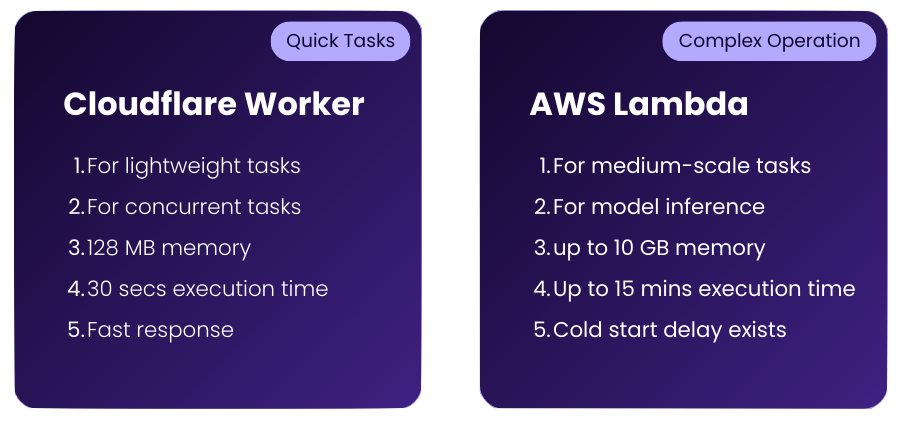 - Quick Tasks: For lightweight and fast operations, Agents are delegated to Cloudflare Workers , which are optimized for low-latency execution.
